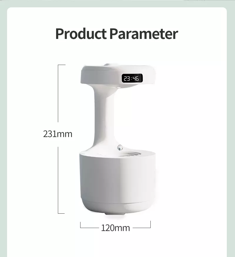 Portable Time Display Water Drop Air Humidifier with Anti-gravity Feature.