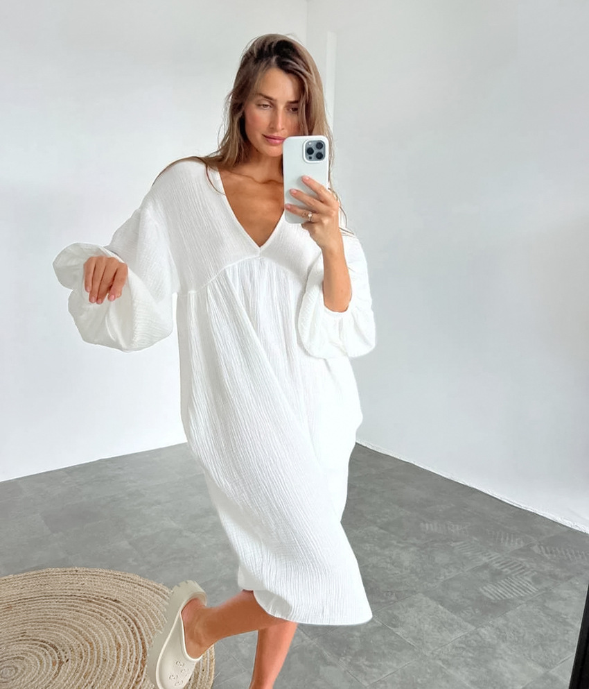 Autumn Europe and the United States long-sleeved nightgown long dress pajamas female V-neck monthly clothing double-layer crepe loose home cross-border morning robe