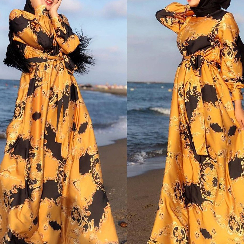 C9281 2023 European and American cross-border spring new Middle East Muslim women's print tie fashion slim dress