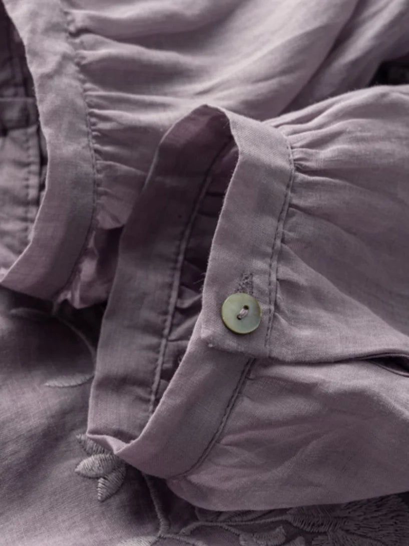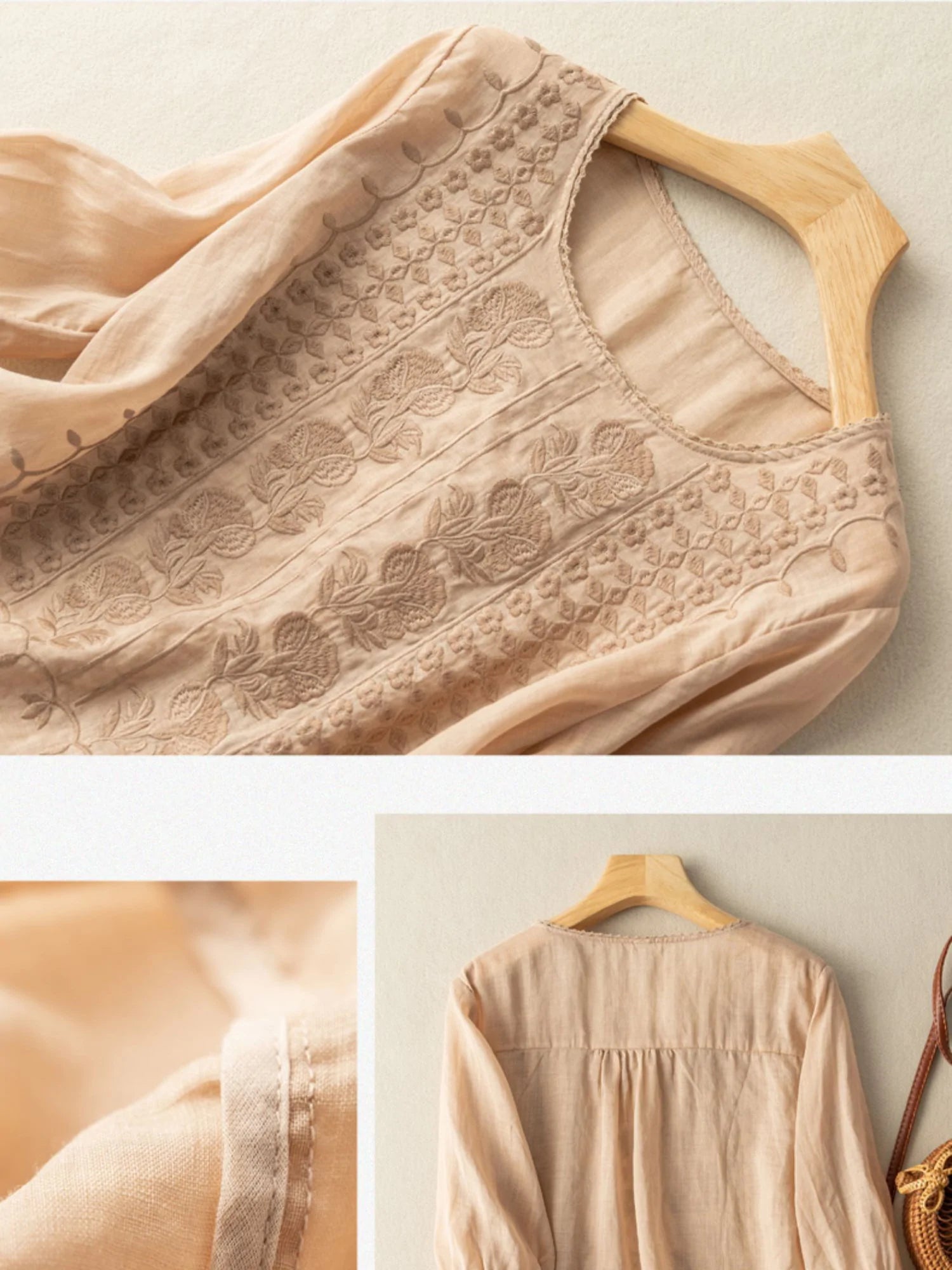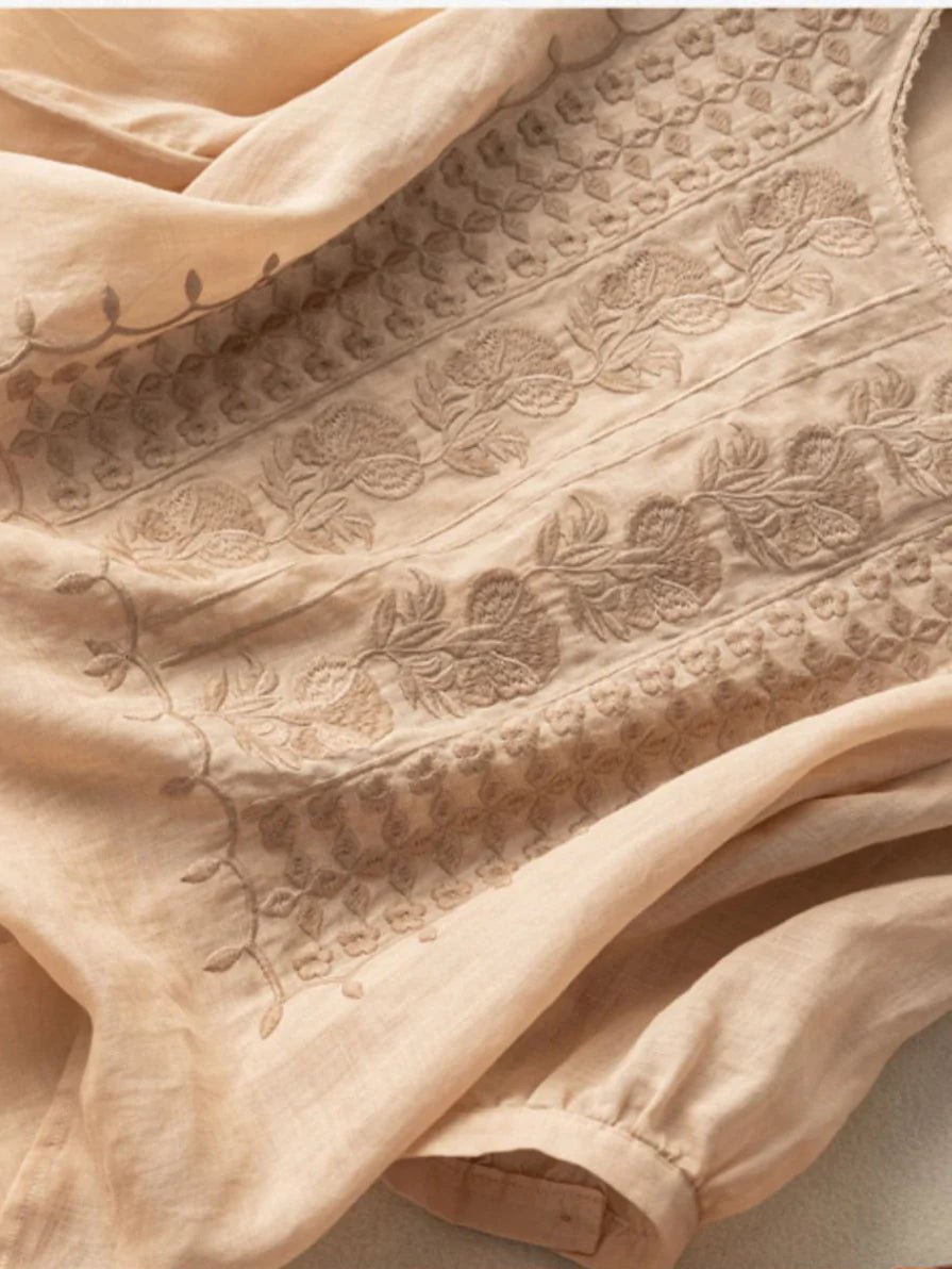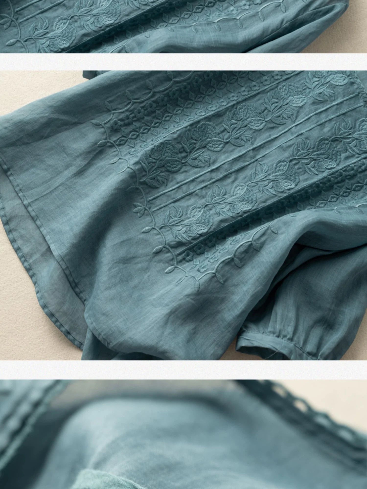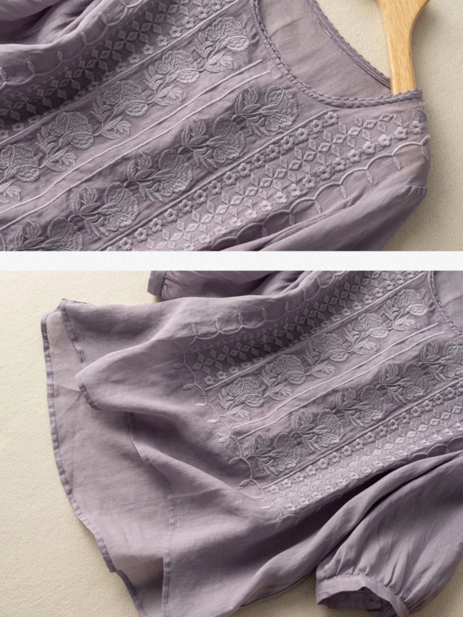 Embroidered Round Neck Half Sleeve Casual Linen Tee Top
