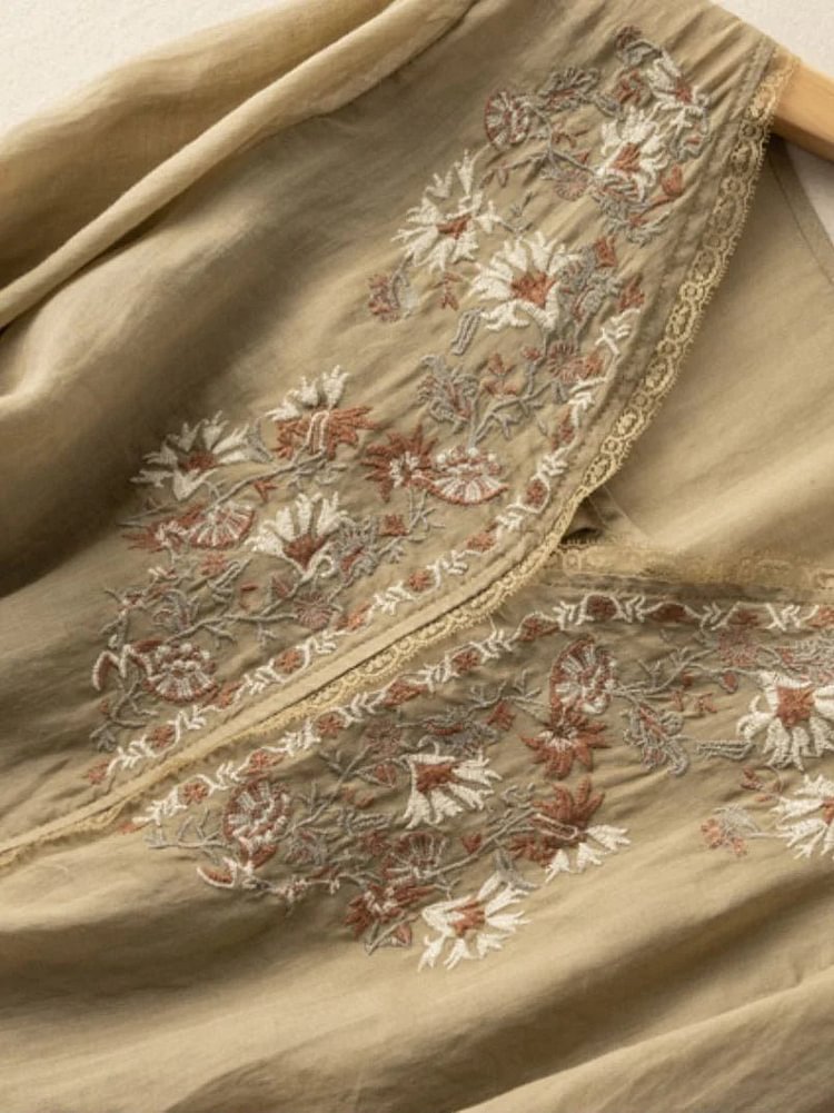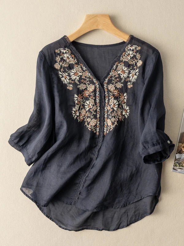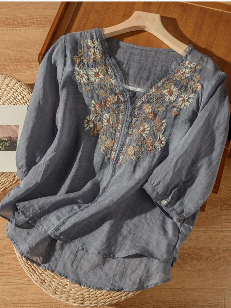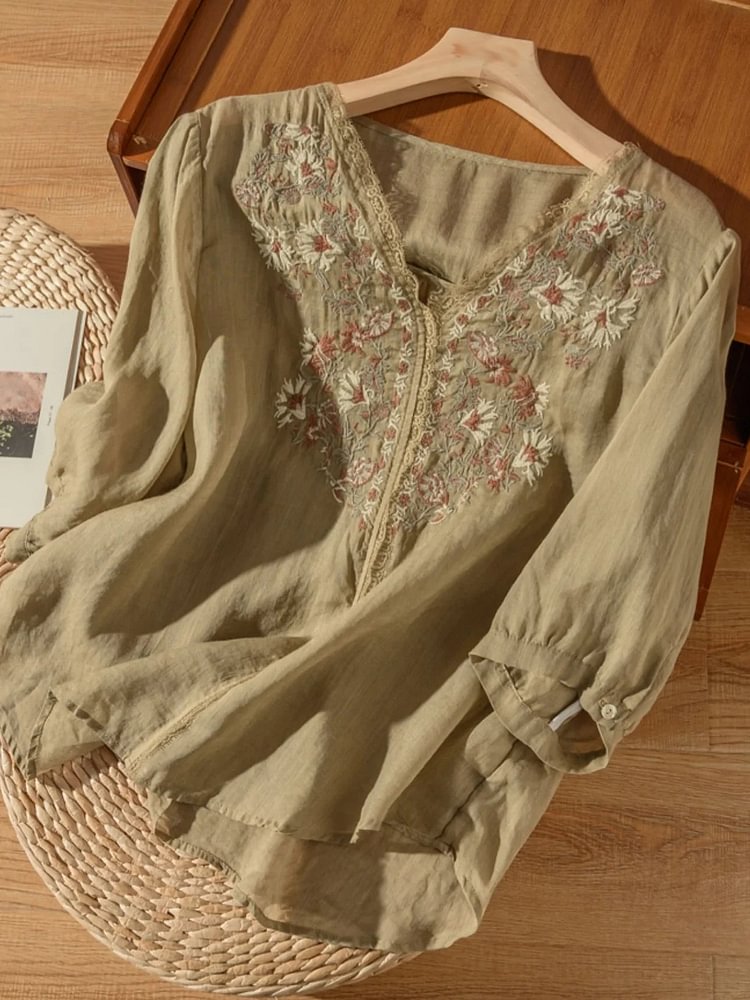 Embroidered V Neck 3/4 Sleeve Casual Linen Top