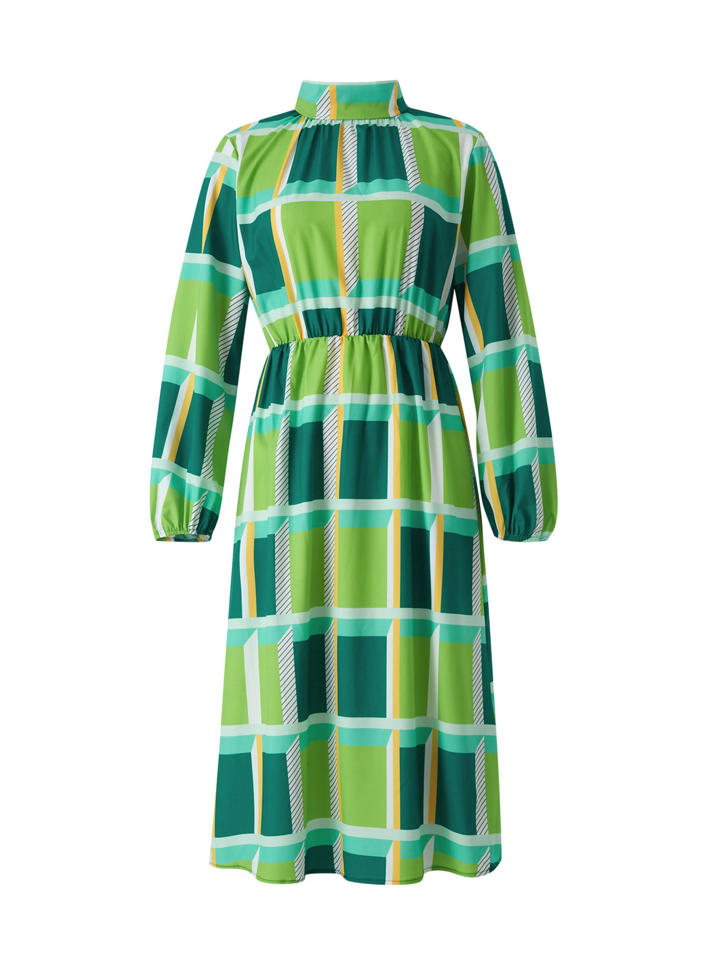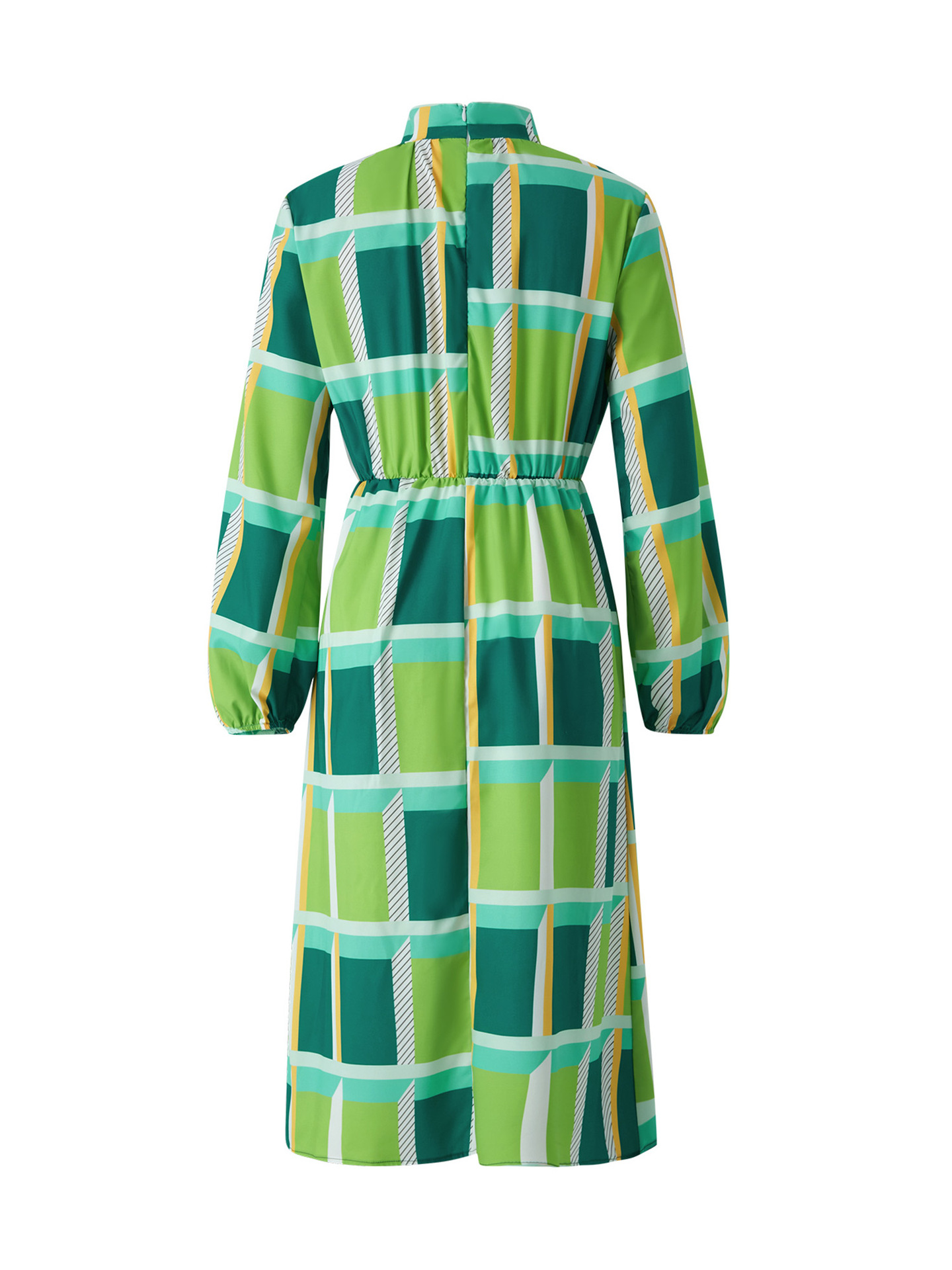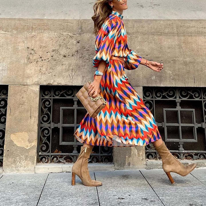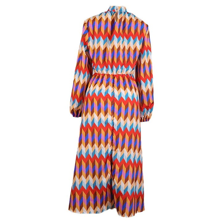 Long-sleeved dress with color printing European and American women's MIDI skirt Bohemian vacation with umbrella skirt