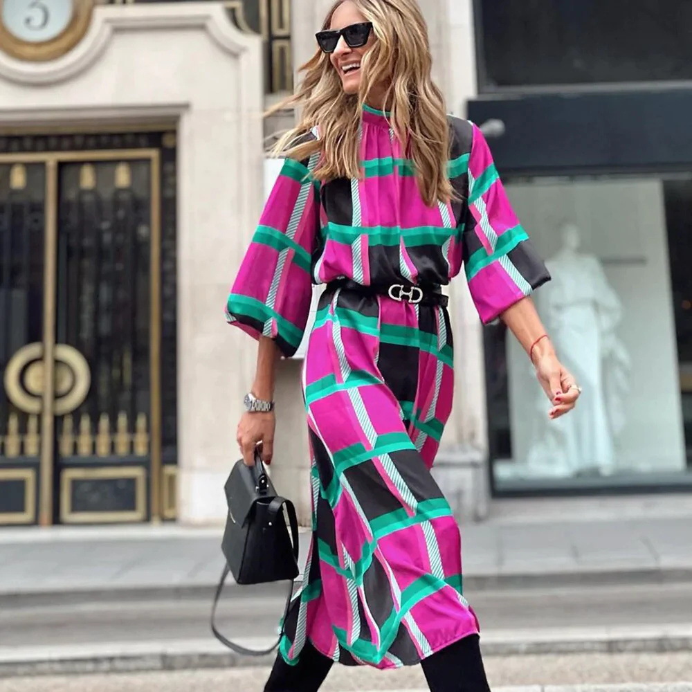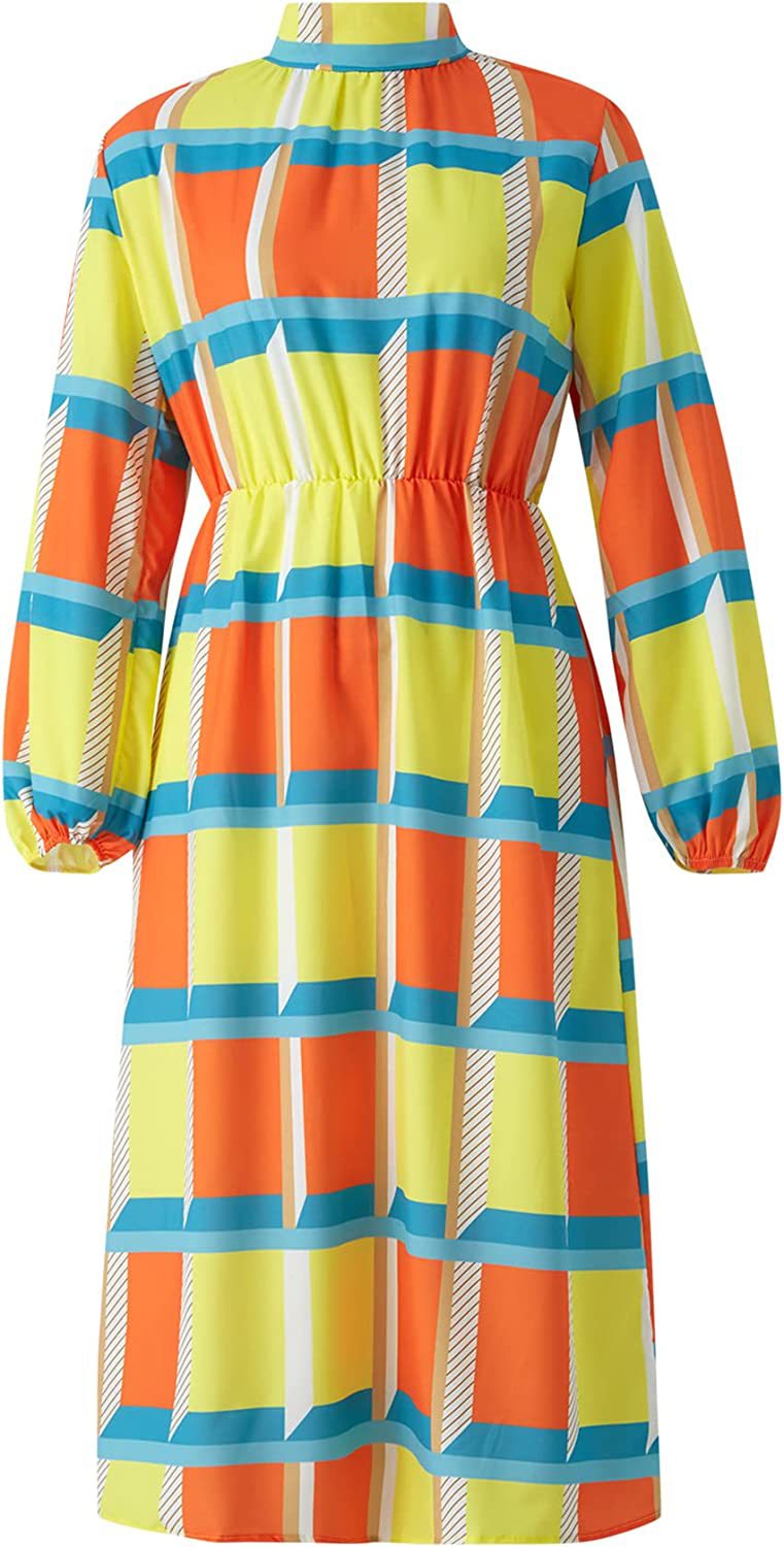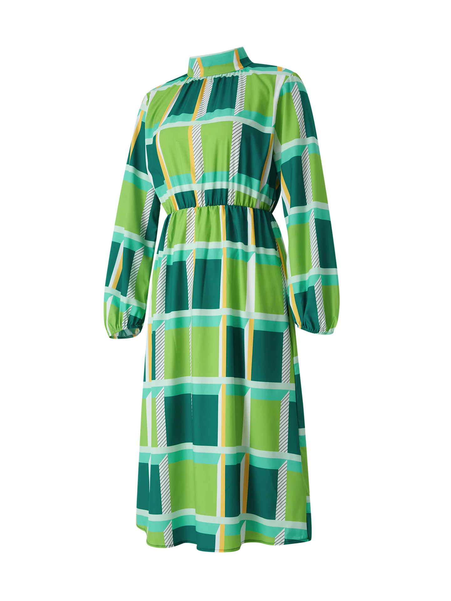 Long-sleeved dress with color printing European and American women's MIDI skirt Bohemian vacation with umbrella skirt